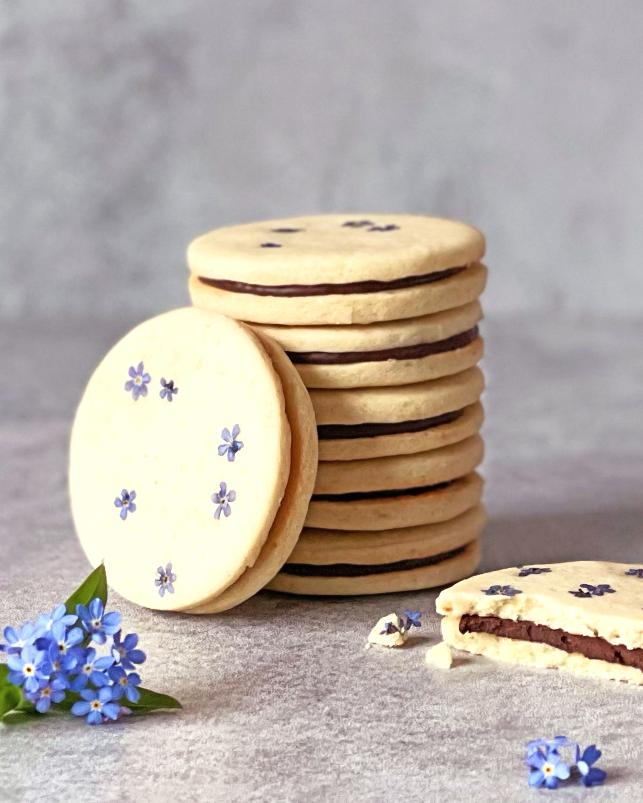 Vegane Doppelkekse mit Schokolade und Vergissmeinnicht